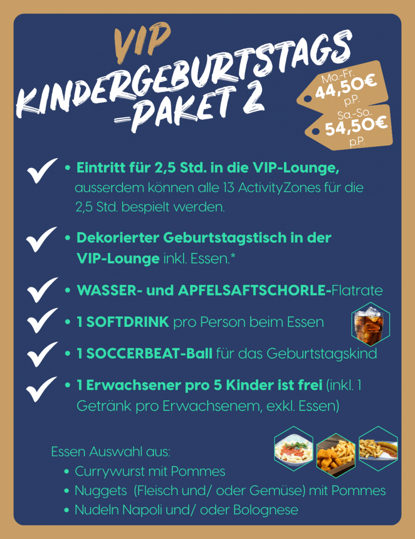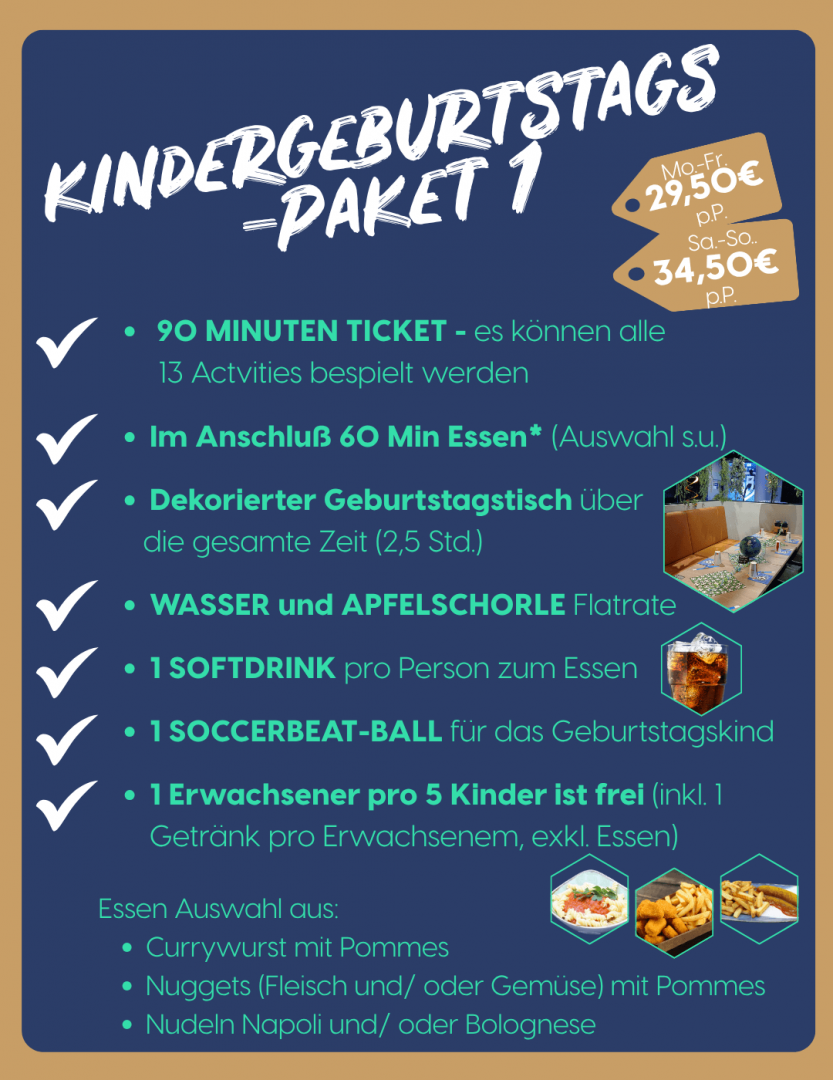 Im Standardpaket ist eine Spielzeit von 90 Minuten in allen 13 Activity-Zonen enthalten sowie eine Essenszeit von 60 Minuten am gedeckten Geburtstagstisch. Zur Dekoration gehören Luftschlangen, eine Geburtstagsgirlande und Fußballservietten. Jedes Kind bekommt ein Armband, einen Becher für die Getränkestation und ein Getränk zum Essen. Das Geburtstagskind erhält zusätzlich einen SOCCERBEAT-Ball als Geschenk.