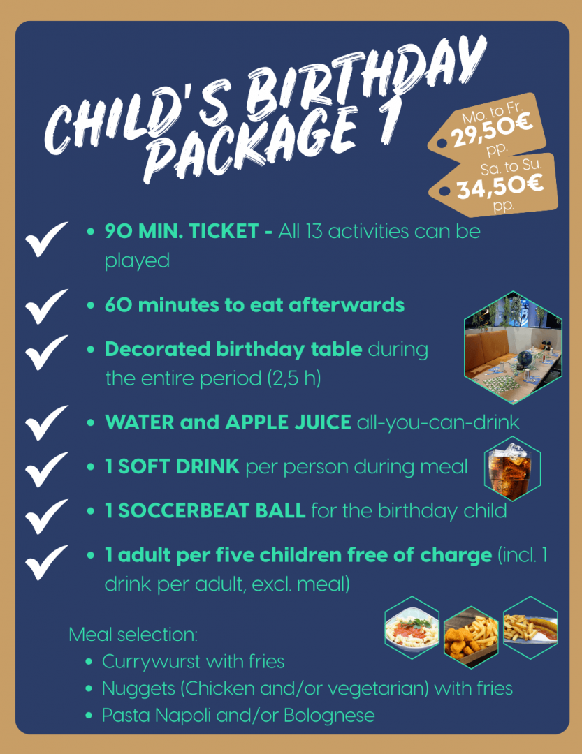 The standard package includes 90 minutes of playtime in all 13 activity zones and 60 minutes of meal time at the set birthday table. Decorations include streamers, a birthday garland, and soccer napkins. Each child receives a wristband, a cup for the beverage station, and a drink with their meal. The birthday child also receives a SOCCERBEAT ball as a gift. The extended package (VIP) includes a longer stay, an exclusive lounge, and additional playtime after the meal.