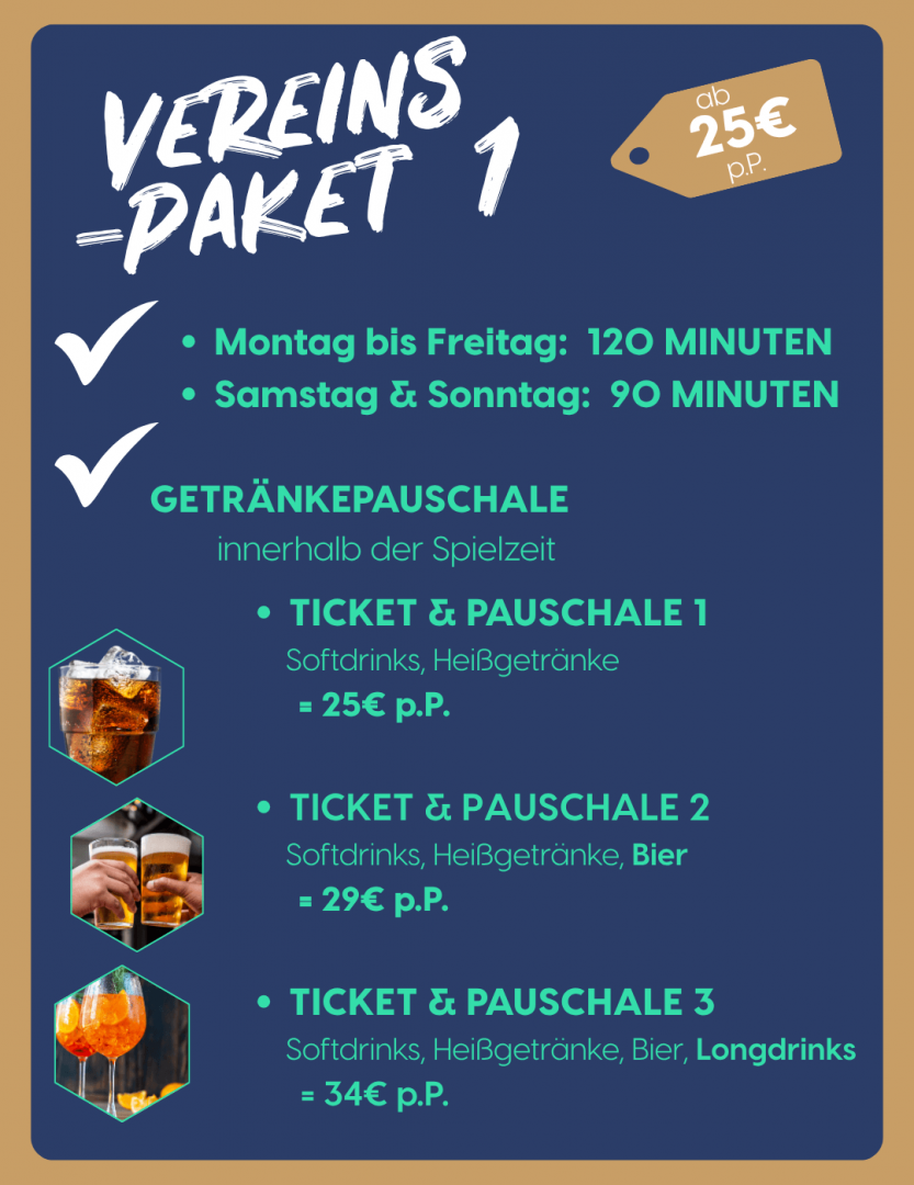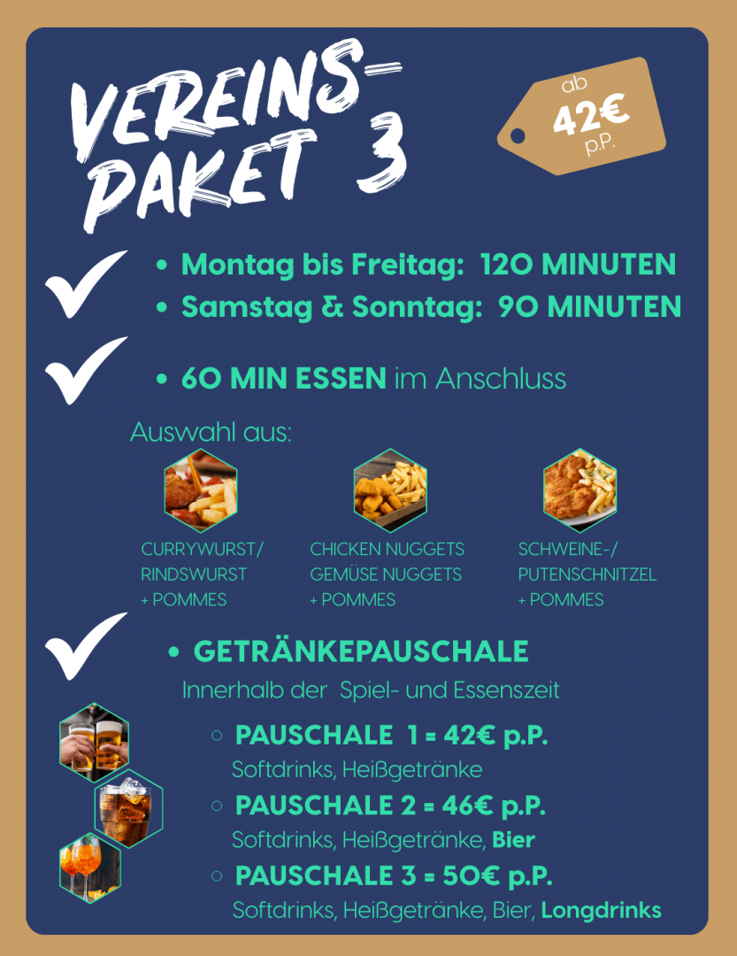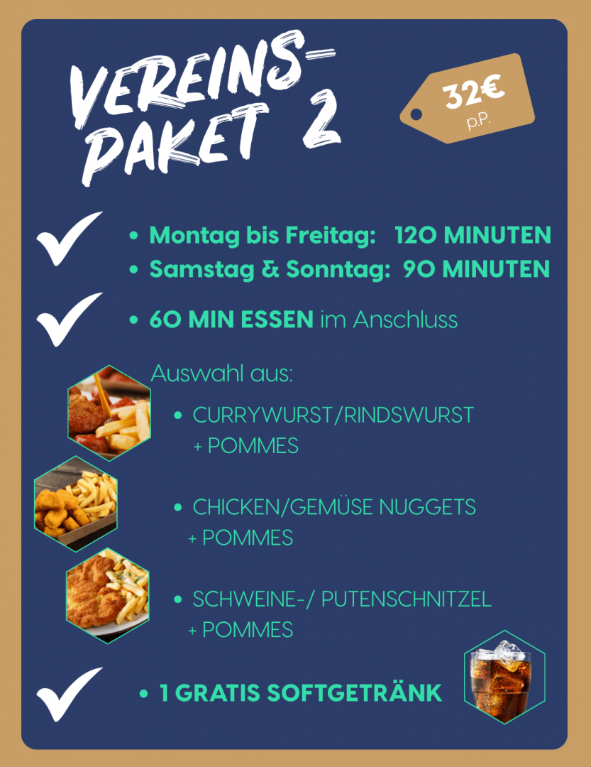 Für Vereine können von Montag bis Freitag 30 Minuten länger spielen - wenn ihr mindestens mit 11 Spielern/Spielerinnen kommt. Zudem haben wir 3 unterschiedliche Pakete inkl. Essen und Trinken, die Ihr bei uns buchen könnt.