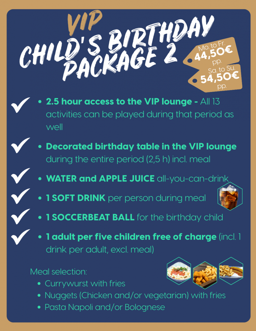 The standard package includes 90 minutes of playtime in all 13 activity zones and 60 minutes of meal time at the set birthday table. Decorations include streamers, a birthday garland, and soccer napkins. Each child receives a wristband, a cup for the beverage station, and a drink with their meal. The birthday child also receives a SOCCERBEAT ball as a gift. The extended package (VIP) includes a longer stay, an exclusive lounge, and additional playtime after the meal.